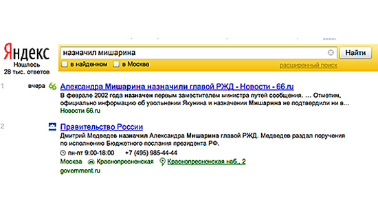 Тем не менее, непричастность к данному скандалу пресс-службы премьера Дмитрия Медведева вызывает большие сомнения. У «Яндекса» все ходы записаны Источник "Ъ" в правительстве сообщид, что была даже внутренняя рассылка документа, его получили сотрудники аппарата. "Но, честно говоря, он сразу вызвал подозрение. Если снять главу ОАО РЖД и можно в одночасье, то сразу назначить нового, без каких-либо консультаций,— это как минимум странно",— отметил источник "Ъ". Сообщение об увольнении Владимира Якунина с поста президента ОАО «РЖД» и назначении на этот пост вице-президента РЖД Александра Мишарина было опубликовано на сайте правительства, свидетельствуют результаты поиска в «Яндексе». Если