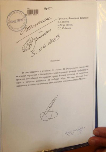 Мосизбирком удовлетворил любопытство кандидата в мэры Москвы Алексея Навального, который в поисках письменного согласия Владимира Путина на выдвижение Сергея Собянина дошел до суда: председатель МГИКа продемонстрировал журналистам документ, без которого врио мэра не могли зарегистрировать кандидатом в градоначальники. "Такой документ есть. В соответствии с действующим законодательством, 17 июля от Сергея Семеновича Собянина получено письменное разрешение на выдвижение, подписанное Путиным", - цитирует РИА "Новости" слова председателя Мосгоризбиркома Валентина Горбунова, которые тот произнес, показывая документ журналистам. Бумага, которую держал в руках Горбунов - это заявление Собянина с визой Путина "Согласен", отписывает "Интерфакс". "У меня нет сомнений, что это подпись президента", - заявил Горбунов, держа в руках разыскиваемое Навальным согласие. Один из таких снимков Горбунова с согласием Путина публикует в Twitter Навальный с ироническим комментарием: "А нельзя ли взглянуть поближе, извините". Пользователи микроблога услышали просьбу Навального и поделились ссылкой на фотографию документа крупным планом, на котором можно разобрать текст заявления, подпись Путина и дату. У интернет-пользователей, однако, возникли вопросы. "Обратите внимание! Заявление написано от мэра, в то время как он мог подать заявление уже только как ВРИО", - подсказывают Навальному в Twitter. Глава штаба Навального Леонид Волков также не удовлетворен увиденным. "То есть документа и правда нет, есть только некая виза Путина. Клоуны, а", - пишет Волков в Twitter. "Особо доставляет, что Собянин пишет заявление Путину без даты и не на бланке. Документ!" - добавил в Twitter Волков. В том, как продемонстрировали документ - на пресс-конференции и издалека - интернет-пользователи нашли повод для издевки. "Избирком, нервно озираясь, показал документ и сразу же запахнул плащ", - острит @ivan_f_davydov.