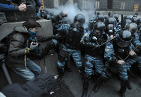 Вечером в воскресенье акция сторонников евроинтеграции в столице Украины Киеве, собравшая около 100 тысяч человек, ознаменовалась серьезным инцидентом у здания Кабинета министров. Там произошла стычка манифестантов с силами полиции, в ходе которой был применен слезоточивый газ. "Беркуту" удалось сдержать толпу, но не более того.