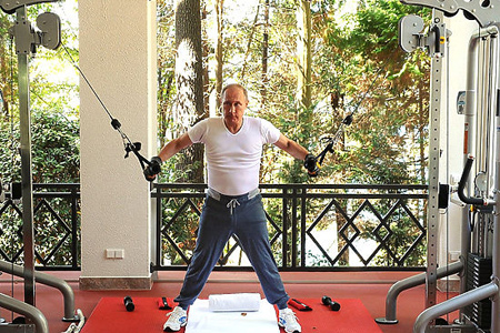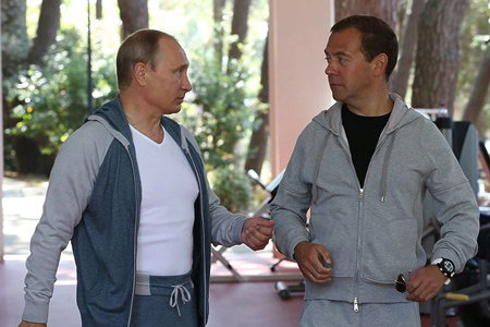 Владимир Путин и Дмитрий Медведев, встретившись в Сочи в последние выходные августа, сначала посетили бои без правил, а на следующее утро отправились на совместную зарядку, где сделали упор на силовые упражнения. Пользователи соцсетей по достоинству оценили спортивную выправку руководителей государства, но остались в недоумении из-за отсутствия малейших признаков импортозамещения в их окружении. Оказалось, что ВВП и ДАМ носят одежду известных западных брендов и пользуются тренажерами американского производителя. Отношения в тандеме Путин—Медведев переживают очередной ренессанс. За последний месяц президент и премьер провели несколько совместных официальных и неофициальных мероприятий, призванных доказать, что главы государства и правительства действуют в одной связке и никаких разногласий — ни в быту, ни в политике — между ними нет. Хотя ни ВВП, ни ДАМ в этом году не брали официальных отпусков, на юге они провели достаточно много времени (чему подтверждение — ярко выраженный загар премьера). Начиная с весны Путин приезжал в Сочи практически каждые выходные, иногда устраивая себе так называемый «длинный уик-энд» с захватом пятницы и понедельника. Широкой общественности об этой стороне жизни главы государства, как правило, ничего неизвестно, но на сей раз пресс-служба Кремля решила сделать исключение, разместив на официальном портале kremlin.ru «домашние» снимки президента и присоединившегося к нему премьера.