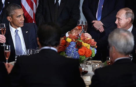 Путин прокомментировал официальное фото на официальном завтраке в честь 70-летия генсека ООН. Журналист предположил, что секретарь ООН Пан Ге Мун специально ушёл, чтобы Обама и Путин могли выпить вдвоем. «Все‑таки представители прессы меня все время удивляют и радуют своей непосредственностью, — со смехом ответил на это Путин. — Бокалы были подняты в связи с тостом, который произнес Генеральный секретарь ООН – и он был на трибуне. И Президент Соединенных Штатов, как вежливый человек, просто поднял свой бокал, и мы с ним чокнулись за здоровье Генерального секретаря и развитие ООН. Сейчас из этого пытаются слепить что‑то совершенно даже непонятно откуда взявшееся. Ничего за этим нет, ничего за этим не стоит, это протокольное мероприятие и ничего больше. Вот разговор, который состоялся, был, действительно, я уже говорил, конструктивным, обстоятельным и, на мой взгляд, очень открытым», — подчеркнул Путин.