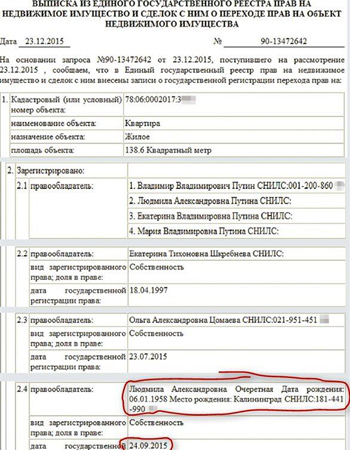 Среди учредителей Центра развития межличностных коммуникаций, по данным ЕГРЮЛ, также есть люди из окружения Путина, в частности Татьяна Шестакова, жена друга детства и спарринг-партнера президента по дзюдо Василия Шестакова. В январе 1995 года семья Путиных стала счастливой обладательницей 139-метровой квартиры на Васильевском острове. Однако три года спустя, после их переезда в Москву, права на недвижимость были переоформлены на Екатерину Шкребневу, тещу Владимира Путина. Новый паспорт (серия: 45**, №8888**) Людмила Путина на фамилию Очеретная получила 2 февраля прошлого года непосредственно в Управлении Федеральной миграционной службы по городу Москве, а не в традиционном для таких случаев территориальном органе ФМС, что лишний раз подчеркивает ее особый статус.