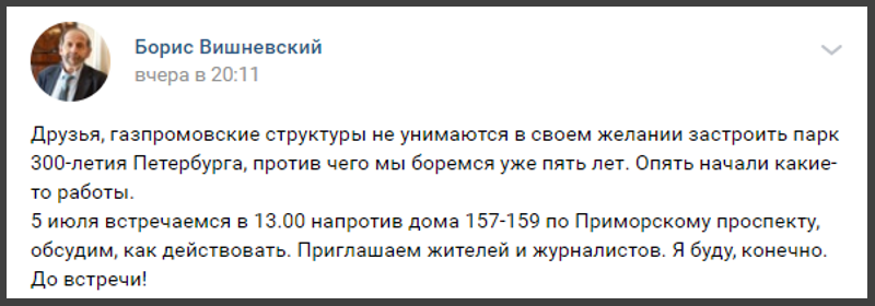 Вишневский искажает факты рассказами о незаконной стройке в парке 300-летия Петербурга