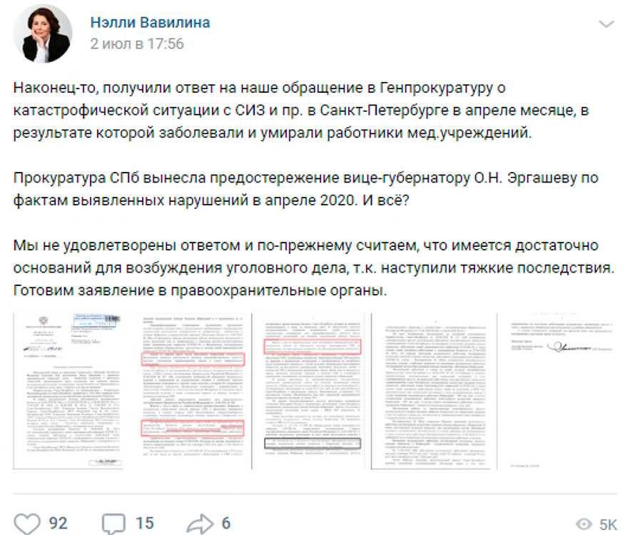 Во время тяжелой эпидемиологической обстановки в России вице-губернатор Северной столицы по здравоохранению Олег Эргашев стал объектом травли со стороны оппозиционных СМИ из-за якобы проваленной борьбы с коронавирусом. Вице-губернатора беспочвенно обвинили в неспособности своевременно обеспечить медучреждения Санкт-Петербурга средствами индивидуальной защиты в апреле 2020 года. В результате оппозиция стала требовать привлечь Эргашева к уголовной ответственности. Одним из инициаторов этой идеи был депутат ЗакСа от «Справедливой России» Алексей Ковалев. Стоит отметить, что на первых этапах распространения коронавируса город действительно столкнулся со множеством трудностей с обеспечением населения СИЗ и аппаратами ИВЛ. Однако впоследствии в ходе проверки работы чиновников Петербурга надзорным ведомством было установлено, что принятые меры в сложившейся ситуации были своевременными и отвечали реалиям той обстановки. Тем не менее, некоторые нарушения все же были выявлены. В частности, были зафиксированы перебои в поставках СИЗ в Северную столицу из-за действия постановления правительства РФ № 431. Кроме того, проверка отметила длительность перепрофилирования медицинских учреждений в инфекционные стационары. При этом прокуратура не нашла достаточных оснований для возбуждения уголовного дела, и Эргашев ограничился только предостережением о недопустимости нарушений закона. Примечательно, что изначально объектом для критики у оппозиционеров был губернатор Петербурга Александр Беглов. Однако позже фокус внимания сместился именно на Эргашева. Именно Алексей Ковалев вместе со своей соратницей по партии Нелли Вавилиной стали инициаторами привлечения к уголовной ответственности вице-губернатора. О подготовке обращения в правоохранительные органы она написала в своем Facebook. ![]() Как было указано выше, проверка не выявила серьезных нарушений. Однако проблемы были и объяснялись целым рядом причин. Во-первых, было тяжело определить действительный масштаб распространения вируса и борьбы с ним. Ввиду отсутствия тестов было трудно выявить инфицированных. Следовательно, необходимые траты также было трудно спрогнозировать. Уже в марте, когда было произведено усиленное тестирование, стало понятно, что проблем с ковидом не избежать. Поэтому оперативно было принято решение о скорейшем снабжении всех перепрофилированных медучреждений, поликлиник и больниц запасами ИВЛ и СИЗ. Однако экономическая ситуация не позволила обеспечить город в короткие сроки таким большим количеством необходимых СИЗ и ИВЛ, поскольку Петербург был не единственным городом, нуждающимся в оборудовании и средствах защиты. При этом перепрофилирование медучреждений также требовало больших затрат. Вследствие чего на поставки выстроилась длинная очередь из сотни больниц, нуждающихся в масках, перчатках и оборудовании. Стоит отметить, что в начале распространения вируса в России производили 60-70 аппаратов ИВЛ и 800 тысяч масок в сутки. Однако ближе к концу марта ситуация улучшилась и производство увеличилось до 1,6 млн масок в сутки, а аппаратов до 700-800. Тем не менее, для эпидемиологической ситуации, сложившейся в апреле, этого было мало, так как спрос был слишком велик. В таких условиях поменять что-либо не могли ни Эргашев, ни Беглов. Второй причиной