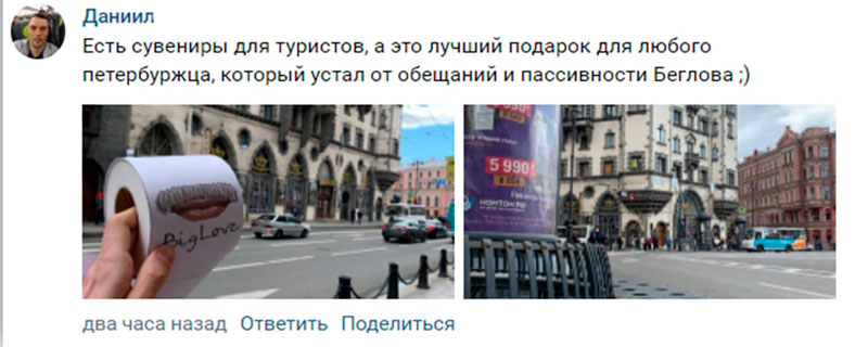 Постоянные провалы Беглова вдохновили петербуржцев на создание туалетной бумаги с портретом губернатора города. Интернет-пользователи отмечали в комментариях, что раз Беглов подтирается проблемами петербуржцев, то и они могут подтереться…