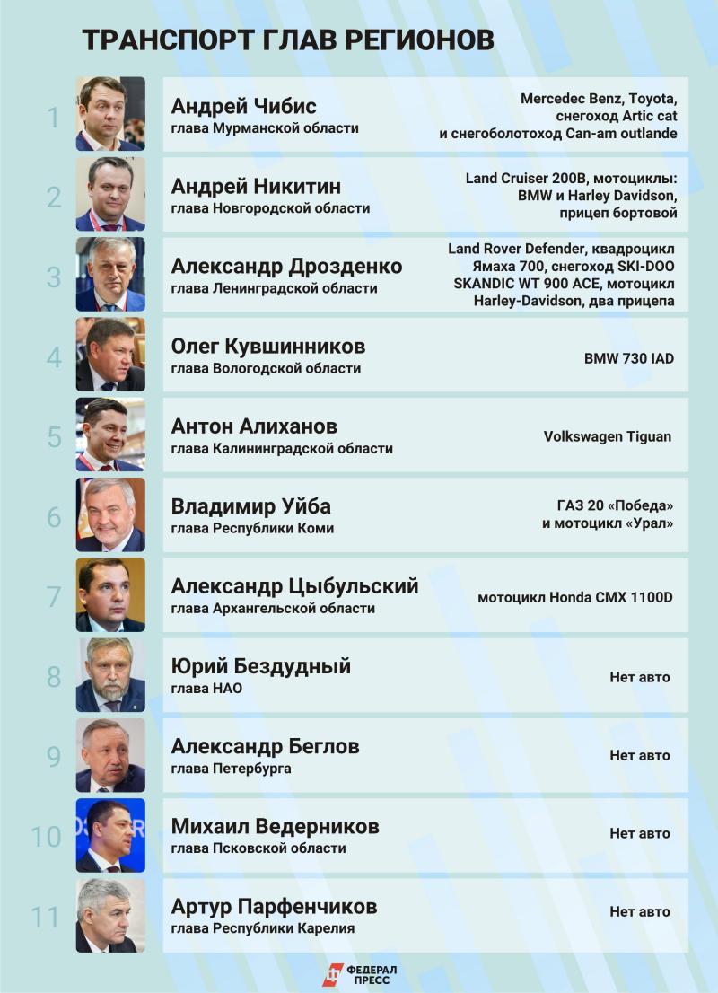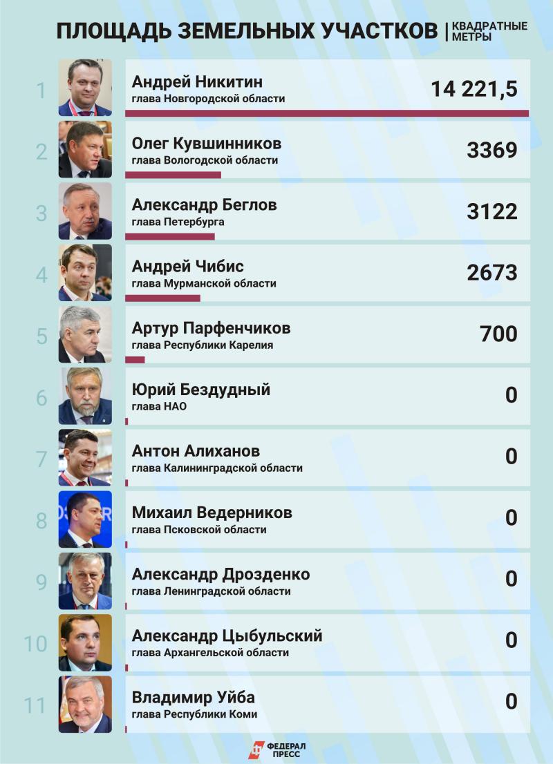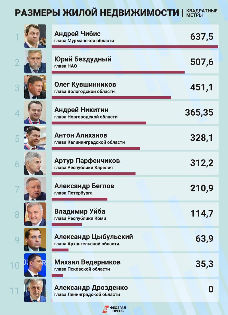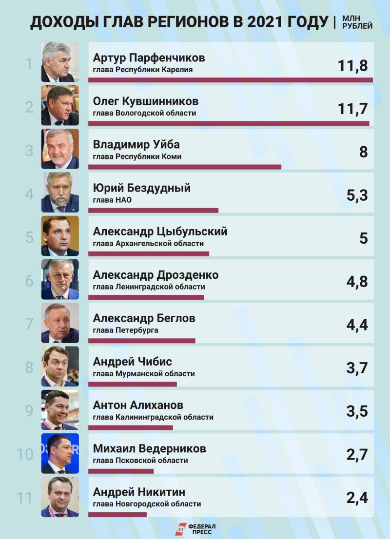 Ежегодно главы регионов отчитываются о доходах и имуществе. Их богатство составляют не только миллионы рублей, заработанные за год, но и квартиры, дачи, машины. «ФедералПресс» составил рейтинг доходов губернаторов округа. Сколько заработали главы регионов СЗФО В 2021 году больше всех заработал, согласно декларациям, глава Карелии Артур Парфенчиков. Его доход составил 11,8 млн рублей. В эту сумму входят средства, полученные от сдачи квартиры в аренду – 4,2 млн рублей. Годом ранее он заработал немногим меньше – 11,4 млн рублей. На втором месте по доходам оказался губернатор Вологодской области Олег Кувшинников с 11,7 млн рублей. Его заработок увеличился по сравнению с 2020 годом, когда он задекларировал 8,3 млн рублей. На третьем месте разместился глава Республики Коми Владимир Уйба. Он заработал 8 млн рублей в 2021 году. В целом его доход стабилен: в 2020 году он получил лишь на 107 тыс. рублей больше. Снизились доходы за прошедший год у главы НАО Юрия Бездудного с 7,2 млн рублей, который он задекларировал за 2020 год, до 5,3 млн рублей. Также и у главы Архангельской области Александра Цыбульского уменьшилась прибыль с 5,8 млн рублей до 5 млн рублей. Обеднел и губернатор Ленинградской области Александр Дрозденко: если в 2020 году он заработал 6,8 млн рублей, то в 2021-м – 4,8 млн рублей. Губернатор Петербурга Александр Беглов за 2021 год также заработал относительно немного – 4,4 млн рублей, что на 350 тыс. больше, чем годом ранее. Глава Мурманской области Андрей Чибис получил доход в 3,7 млн рублей, тогда как за 2020 прибыль составила 3,1 млн рублей. Губернатор Калининградской области Антон Алиханов также оказался в нижней строке рейтинга с 3,5 млн рублей дохода. В 2020 его годовая прибыль была 20,4 млн рублей из-за продажи квартиры и использования кредитных средств. Главы Псковской и Новгородской областей Михаил Ведерников и Андрей Никитин замыкают список. Их доходы составили 2,7 и 2,4 млн рублей, соответственно. Причем и годом ранее они заработали примерно столько же. ![]() Квартирный вопрос глав регионов Больше всего метров жилой недвижимости у губернатора Мурманской области Андрея Чибиса. Он владеет двумя дачными домами – 139,1 кв. и и 74,2 кв. м, одним гостевым – 39 кв. м. Также в его собственности две просторные квартиры – 133 кв. м и 76,2 кв. м. Кроме того, глава Заполярья имеет большой – 176 кв. м – таунхаус в Испании. В довершение ко всему в собственности у Чибиса летняя беседка, домик сторожа, машино-место, вместительный сарай 63,4 кв. м и два гаража – 33,4 кв. м и 101,8 кв. м. На втором месте по жилой площади глава НАО Юрий Бездудный. У него три квартиры: 118,3 кв. м, 300,3 кв. м, 118,7 кв. м, одна из которых в долевой собственности, и парковочное место. В тройку лидеров по квадратным метрам попадает и Олег Кувшинников с большим домом в 259,5 кв. м и дачей – 191,6 кв. м. У главы Новгородской области Андрей Никитин два дома в долевой собственности 101,8 кв м и 300,5 кв. м, две небольших квартиры 43,6 кв. м и 38,2 кв. м, а еще ½ доли в жилье размером 164,8 кв. м. Также за ним числится два машино-места, баня и хозблок. На пятом месте губернатор Калининградской области Антон Алиханов. У него три квартиры, две из которых в индивидуальной собственности – 101 кв. м и 195,8 кв. м, а одна – в долевой 85,8 кв. м. За главой эксклава следует губернатор Карелии Артур Парфенчиков с двумя квартирами – 159,3 кв.м. и 102,9 кв. м. и небольшой дачей – 50 кв. м. Главы Северной 