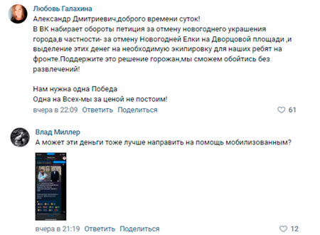 Ранее губернатор Александр Беглов призвал петербуржцев перевести средства на счет в фонде «Победа» на поддержку мобилизованных граждан. Это заявление градоначальника вызвало диссонанс у жителей Северной столицы, которые призвали Смольный использовать средства, выделенные на празднование Нового года, на закупку экипировки для мобилизованных горожан.