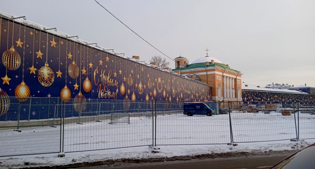 2022 года Возникает вопрос: поменяют ли в очередной раз баннеры на Конюшенном ведомстве, стены которого, складывается ощущение, только за счёт рекламных конструкций ещё и держатся?! В прошлом году именно здесь и заливали один из городских катков. Интересная складывалась бы картина: на одной стене императорских конюшен до сих пор висит баннер в честь Чемпионата Европы по футболу, на другой - грязное полотнище, в котором с трудом угадываются очертания Санкт-Петербурга, новый новогодний баннер, а между ними десятки метров полуразрушенной кирпичной стены, поросшей деревьями и кустами.