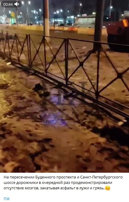 проспекте Большевиков, где асфальт уложили прямо в мокрый снег.